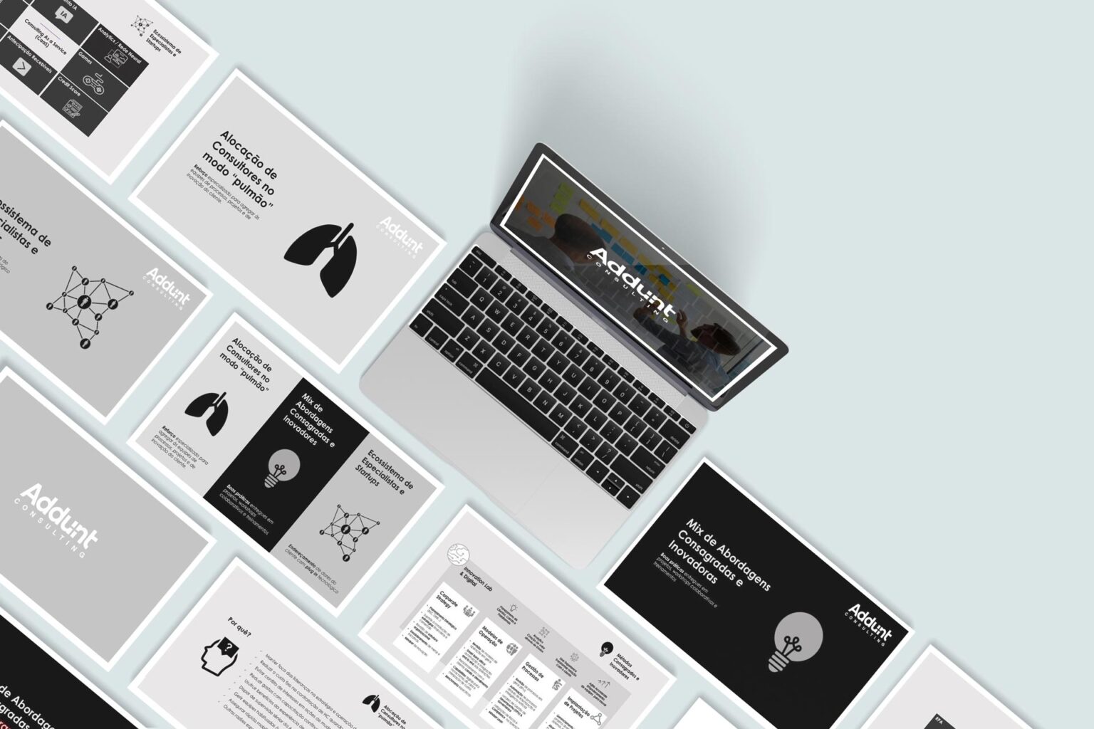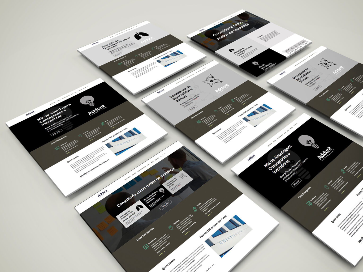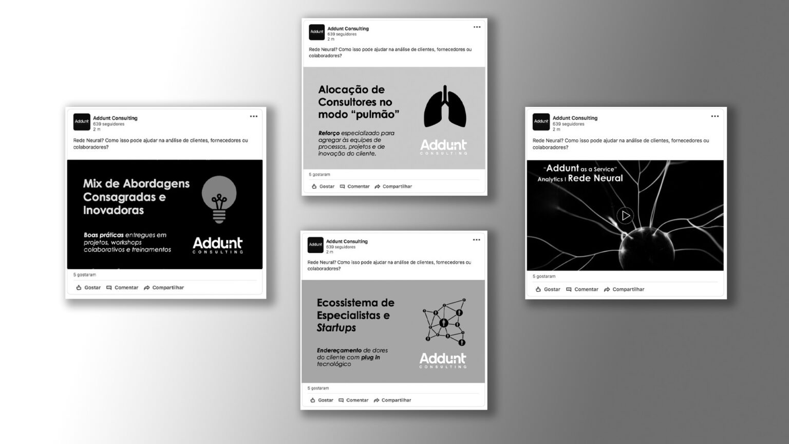 A Addunt Consultoria solicitou a estratégia de Marketing Digital para divulgação de seu novo Mix de Abordagens. O objetivo era apresentar aos clientes o conjunto de soluções consagradas e inovadoras do portfolio de serviços da empresa. Para esta estratégia foi criada a identidade visual, aplicada em banners digitais no site e em postagens nas redes sociais,