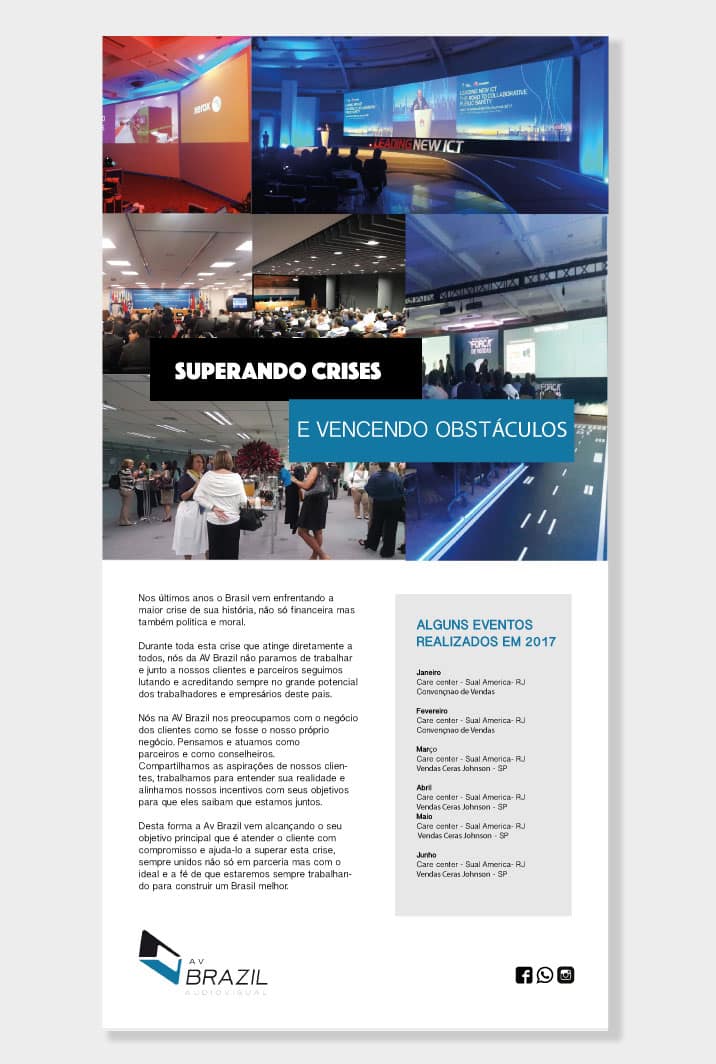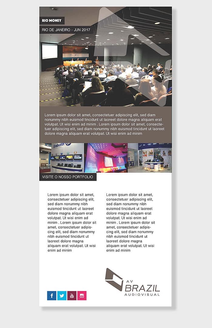 A Campanha de Marketing Digital para a empresa de eventos AV Brazil teve como objetivo a criação de identidade visual e geração de conteúdo na estratégia de relacionamento com seus clientes atuais e stakeholders. Através de email marketing e postagens em redes sociais a campanha divulgou os seus últimos cases. O briefing do projeto tinha como desafio técnico expôr o máximo de imagens diferentes no formato de galeria, dentro do mesmo email, sem criar conflitos com as regras de proteção de dados e ferramentas de bloqueio de spams.