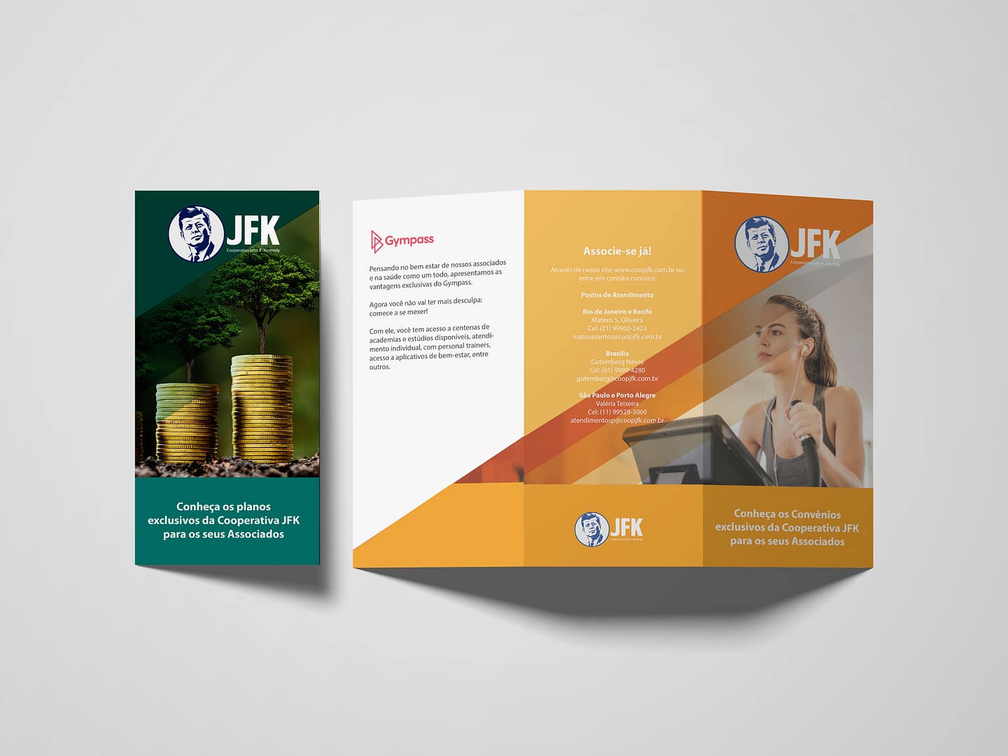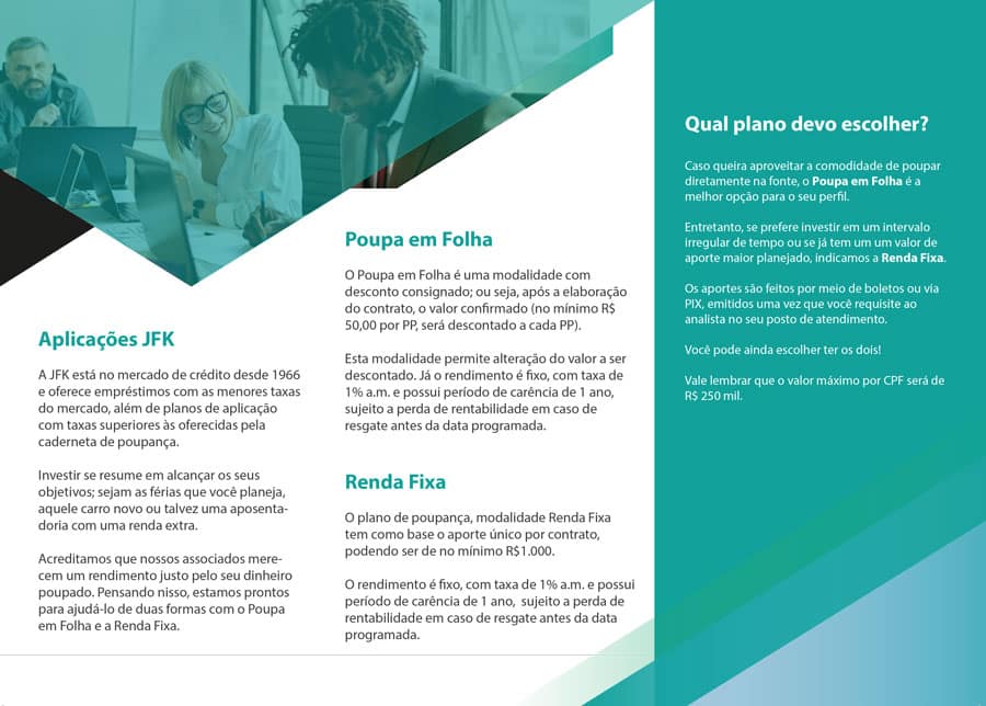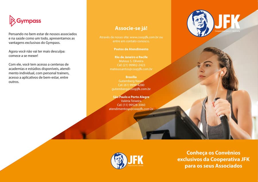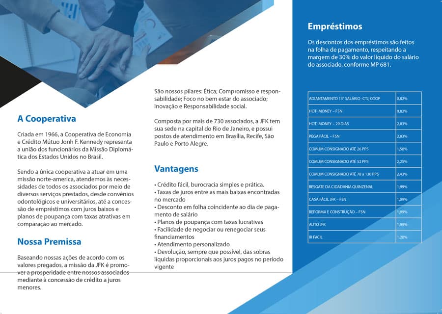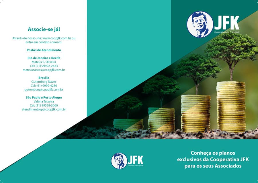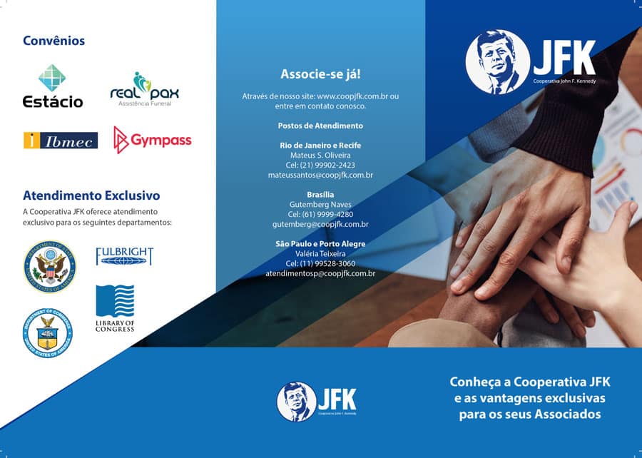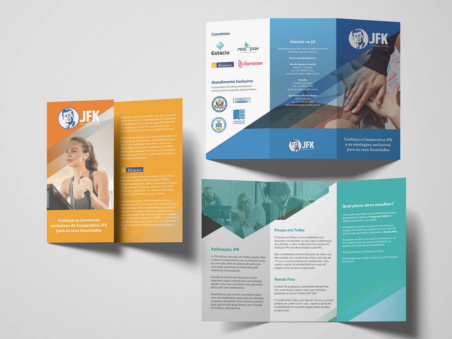 A Cooperativa JFK, instituição financeira que atende aos funcionários do Consulado Americano do Rio de Janeiro, solicitou a criação de folders para a divulgação de seu amplo portfólio de serviços como ação de comunicação interna para este público alvo.