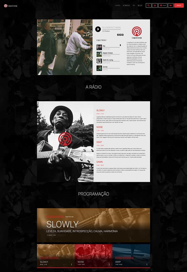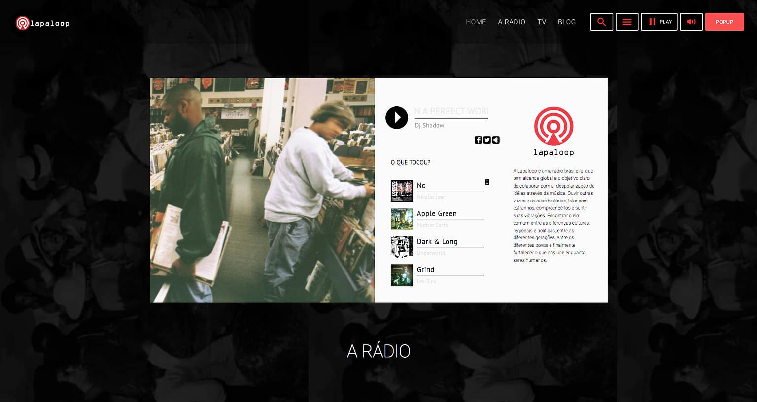 Projeto conceitual de comunicação integrada para a web radio alternativa Lapaloop do Rio de Janeiro. Criação de logo a aplicações diversas, camisetas, fundo de telas, website, banners para propagandas e banners internos.O grande desafio do projeto foi identificar uma ferramenta de shoutcast que atendesse a solicitação de um player que valorizasse a imagem das cover arts, que deveria interagir com a música tocada no momento. Depois de várias alternativas optamos por fim pela tecnologia de stream Azura.A radio está hoje na sua versão 6.0 e competa 16 anos no ar. A renovação de layout é feita esporadicamente.