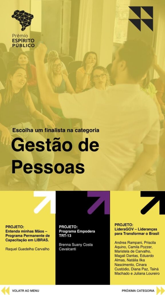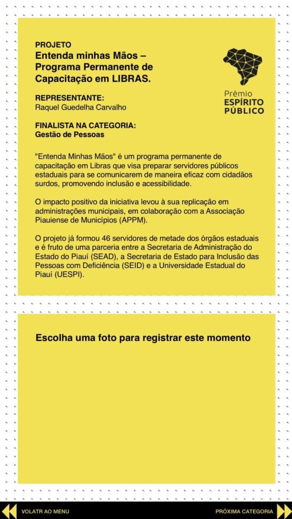O briefing do cliente inclui o desenvolvimento de um banner digital interativo, onde os convidados puderam interagir para conhecer, de forma dinâmica, cada projeto e seus idealizadores. Essa abordagem inovadora visa engajar os participantes e proporcionar uma experiência enriquecedora, destacando a importância das ações dos servidores públicos e suas contribuições para o bem-estar da comunidade.