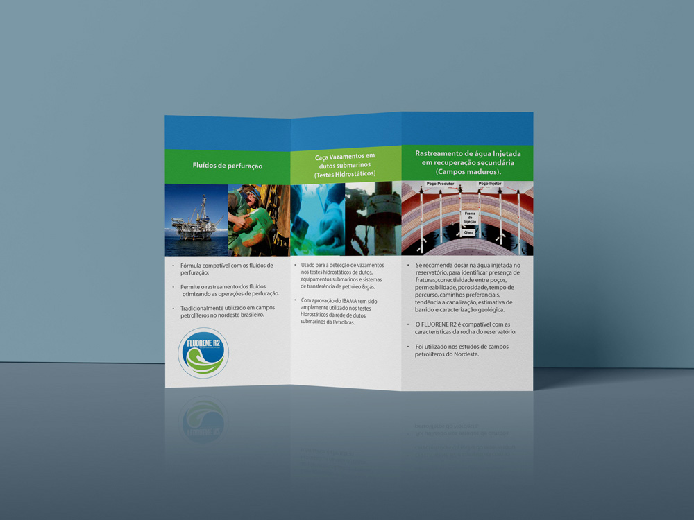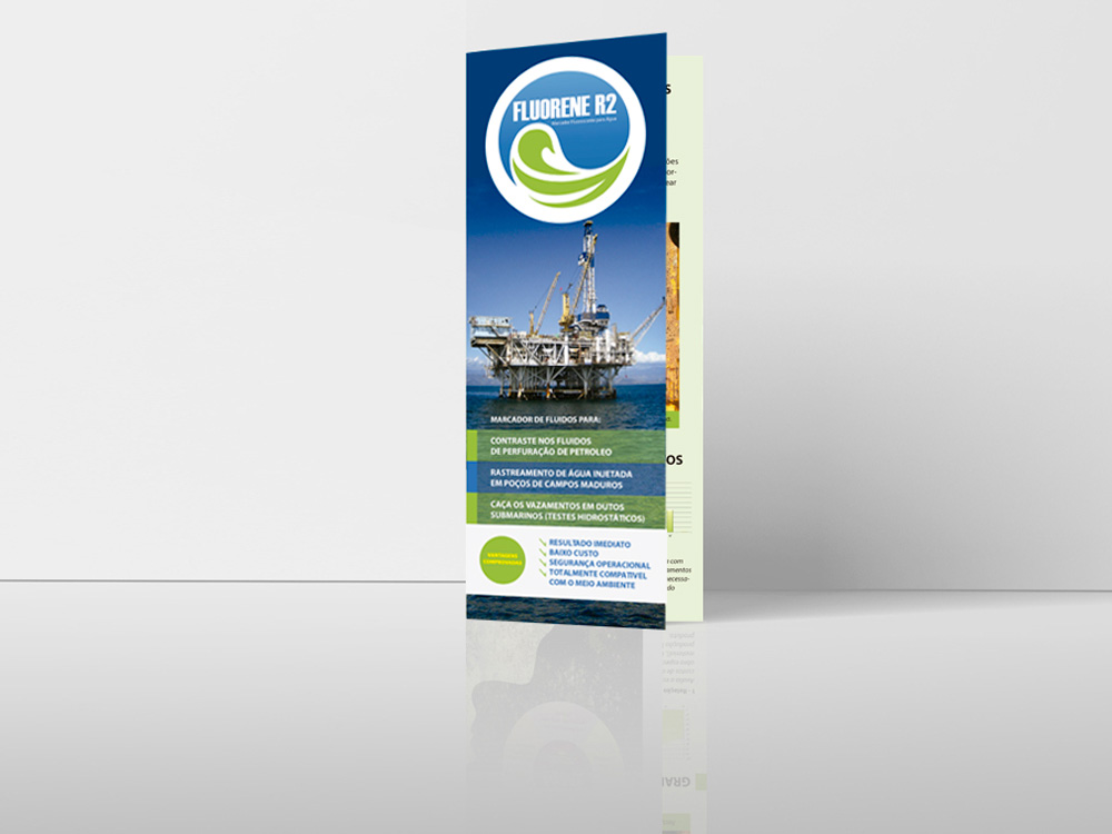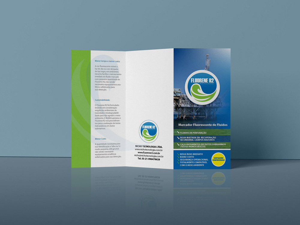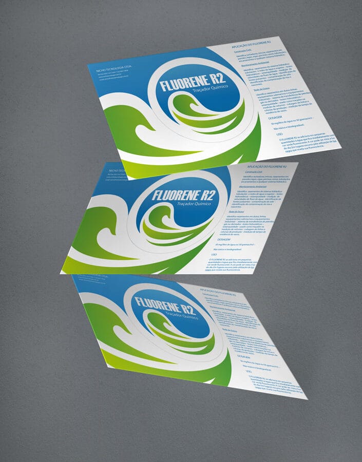Um case completo de Comunicação integrada, este projeto foi solicitado pela empresa de desenvolvimento de rastreadores químicos Nicho Tecnologia para o lançamento do seu produto Fluorene, um rastreador liquido utilizado por empresas como a Petrobras, para a identificação de rachaduras em suas estruturas. O briefing incluiu a criação de um logotipo que representasse a fluidez do liquido de cor fluorescente, a identidade visual para divulgação da marca, o guideline de utilização da mesma, a criação dos rótulos das embalagens dos produtos, o material de divulgação impresso, a landing page do produto e banners digitais para divulgação on line.