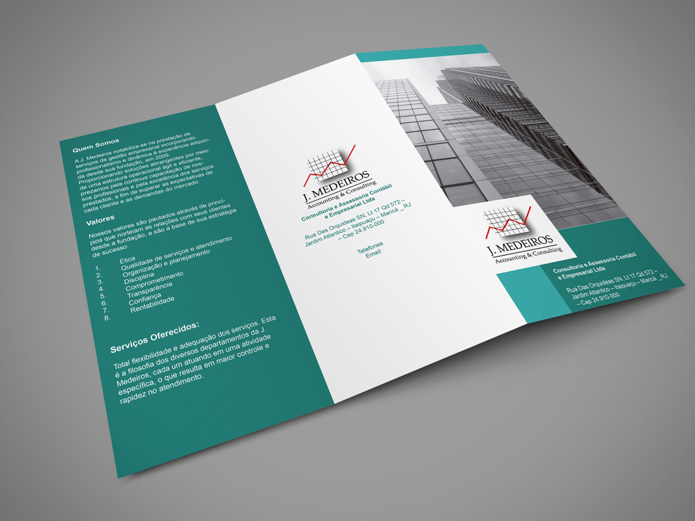 A empresa J Medeiros de Consultoria e Assessoria Contábil solicitou a criação de website, folder e papelaria.