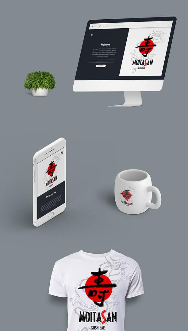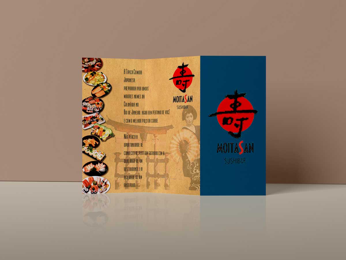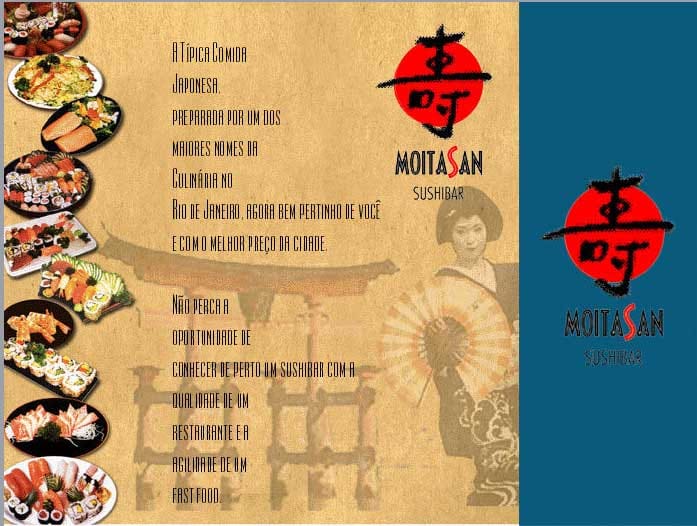 Criação de logomarca e identidade visual para restaurante de comida japonesa Moitasan, localizado no bairro de Botafogo, no Rio de Janeiro. O Projeto de identidade visual incluiu cardápios e papelaria em geral, t-shirts, luminosos para fachada, agendas e sacolas.