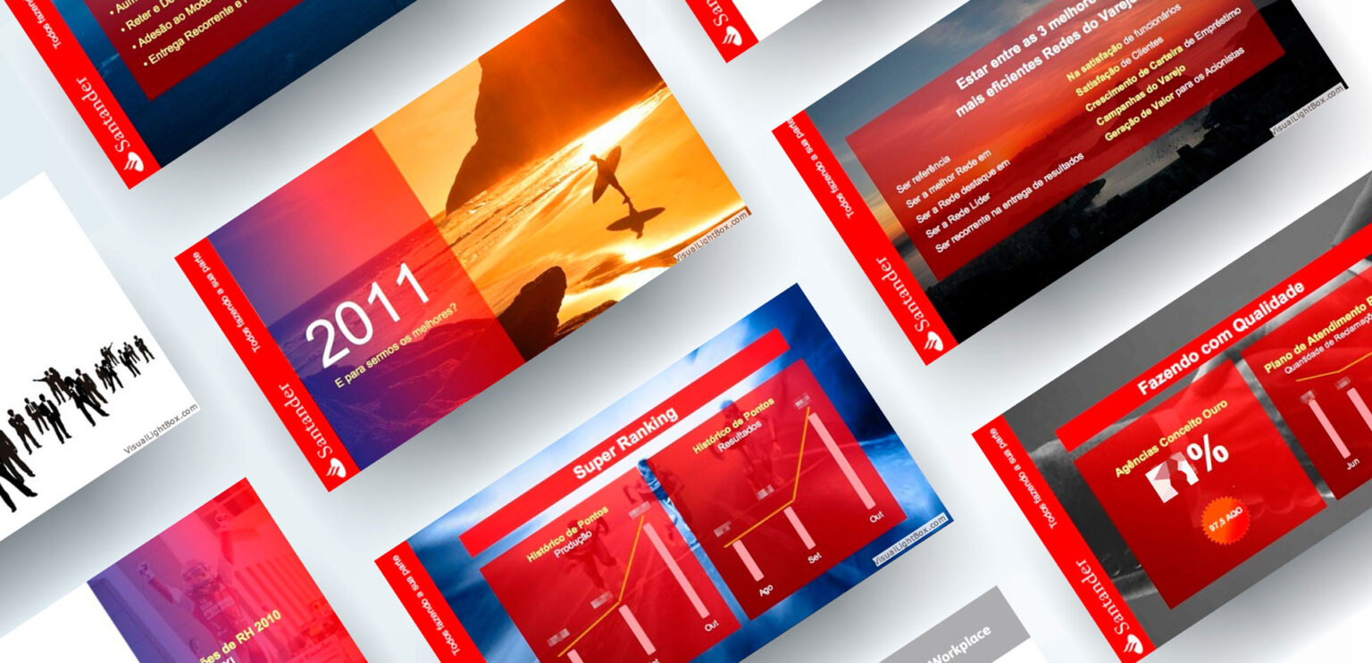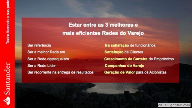 O cliente Banco Santander, agência Centro Rede XI – Rio de Janeiro solicitou a criação de identidade visual para uma apresentação Power Point que seria exibida no evento interno anual KickOff a ser realizado no Centro de Convenções SulAmérica na mesma cidade. O briefing do cliente inclui a associação da imagem do banco com o cenário da cidade do Rio de Janeiro.