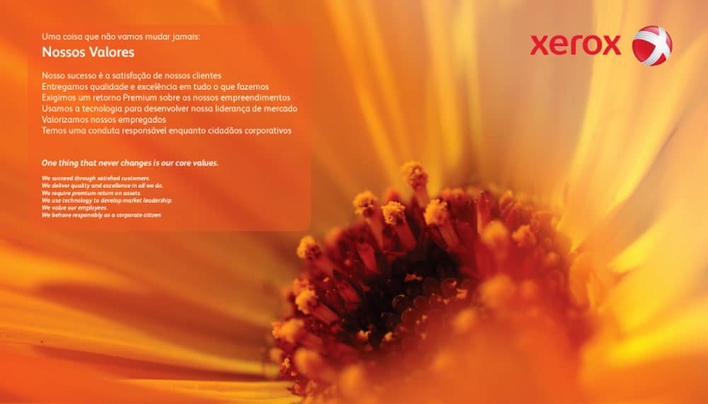 A Xerox Brasil solicitou a criação e produção de painéis divulgando a missão, a visão e os valores da empresa.Os Projetos foram realizados nos escritórios do Rio de Janeiro, Barueri e Avenida Paulista.